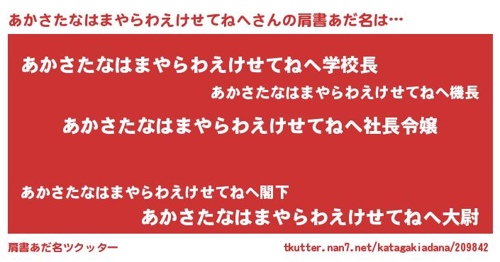 | ツイッター | あかさたなはまやらわえけせてねへさんのツイッターID『konnyaku_kun』 |