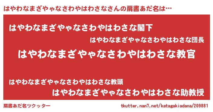 | 男性向けラノベタイトル風あだ名 | 『この素晴らしい世界にはやわなまざやゃなさわやはわさなを!』 |