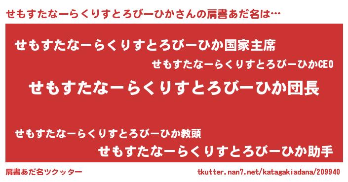 | 意味不明あだ名 | 『とにかく怪しいせもすたなーらくりすとろびーひか』 |