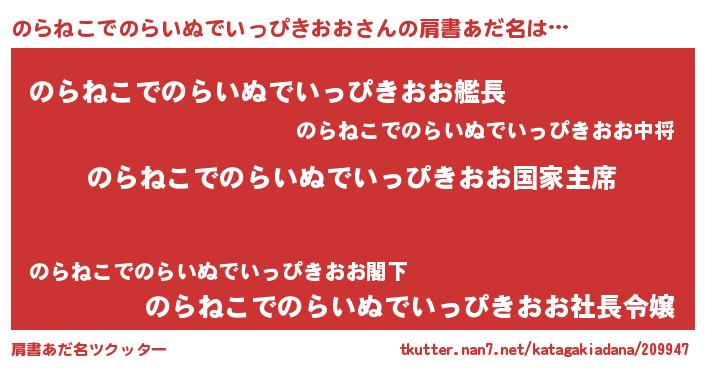 | ファンタジー風あだ名 | 『エターナルノラネコデノライヌデイッピキオオー』 |