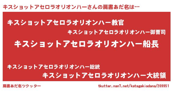 | 欧米人風あだ名 | 『キスショットアセロラオリオンハー・ステッグマイヤー』 |