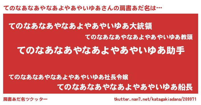 | 男性向けラノベタイトル風あだ名 | 『ノーゲーム・ノーテノナアナアヤナアヨヤアヤイユア』 |