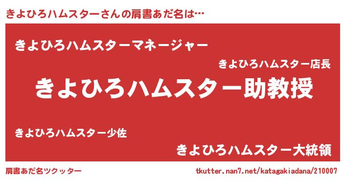 | 男性向けラノベタイトル風あだ名 | 『おまえをオタクにしてやるから、俺をきよひろハムスターにしてくれ! 』 |