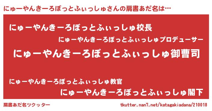 | 胡散臭い通販商品みたいなあだ名 | 『億万長者になれる霊験あらたかなお札…その名も「にゅーやんきーろぼっとふぃっしゅ」』 |
