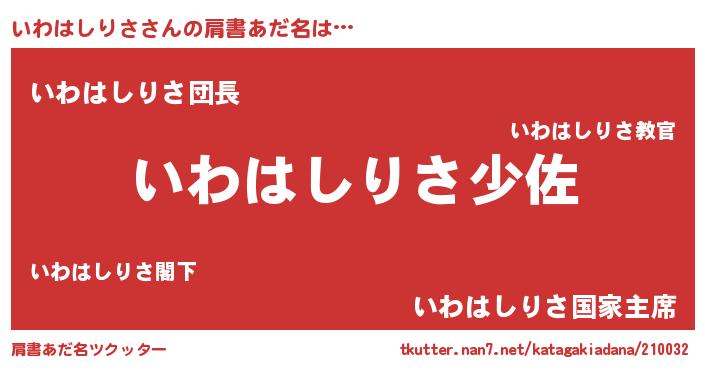 | 男性向けラノベタイトル風あだ名 | 『イワハシリサスレイヤー』 |