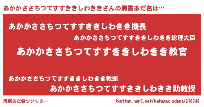 | 男性向けラノベタイトル風あだ名 | 『この素晴らしい世界にあかかささちつてすすききしわききを!』 |