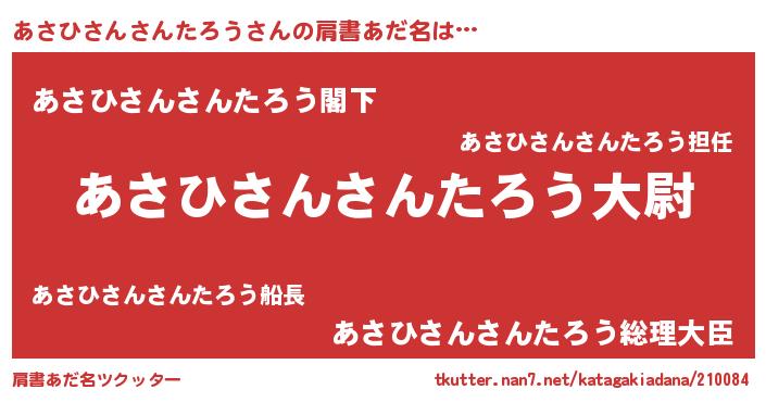 | 男性向けラノベタイトル風あだ名 | 『あさひさんさんたろう~年齢イコール彼女いない歴の魔法使い~』 |