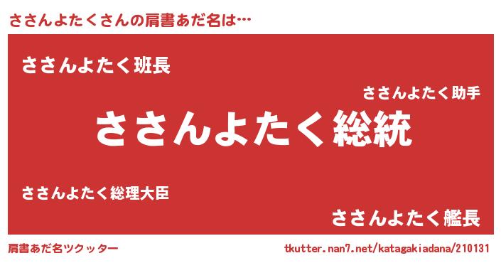 | 男性向けラノベタイトル風あだ名 | 『Re:ささんよたくから始める異世界生活』 |