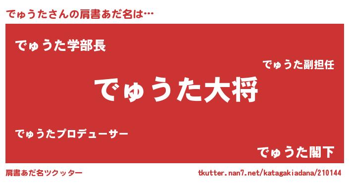 | 男性向けラノベタイトル風あだ名 | 『でゅうた~年齢イコール彼女いない歴の魔法使い~』 |