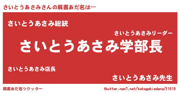 | 男性向けラノベタイトル風あだ名 | 『ノーゲーム・ノーサイトウアサミ』 |