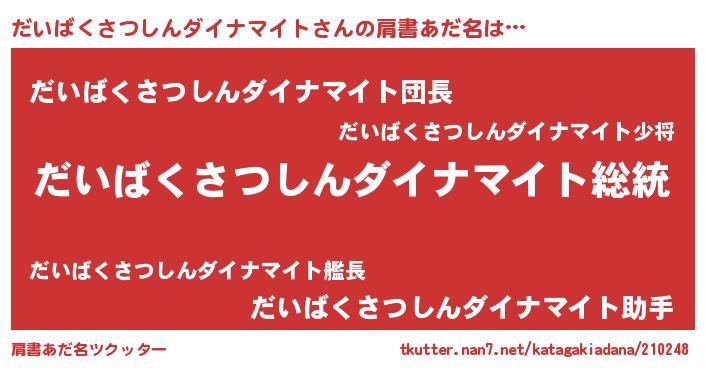 | 女子向けラノベタイトル風あだ名 | 『だいばくさつしんダイナマイトなんてお断りですっ。』 |