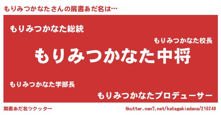 | 女子向けラノベタイトル風あだ名 | 『もりみつかなたの玉の輿計画!』 |