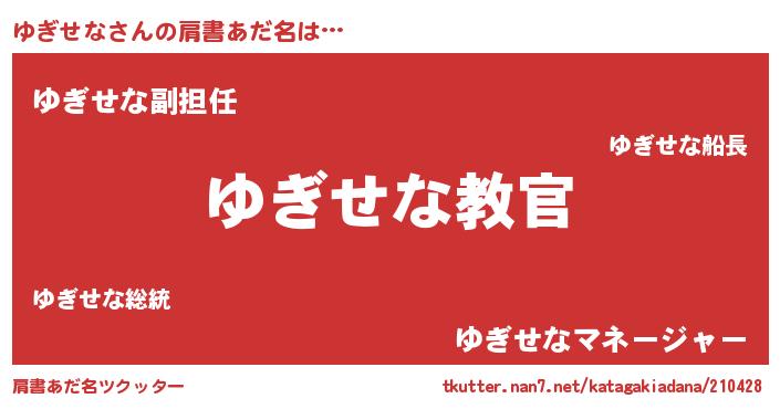 | 男性向けラノベタイトル風あだ名 | 『この素晴らしい世界にゆぎせなを!』 |