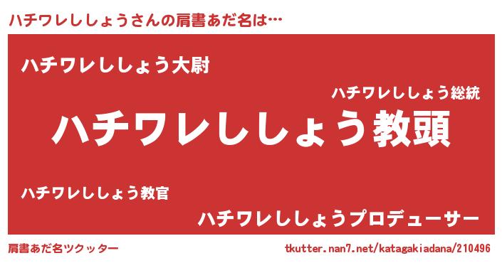 | ヘコむあだ名 | 『ハチワレししょう(笑)』『ハチにゅー』 |