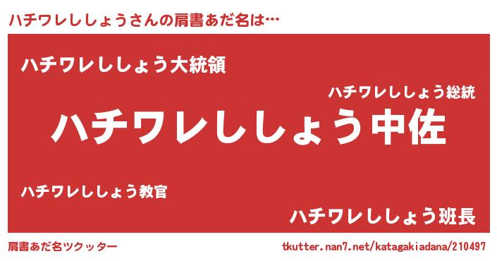 | 男性向けラノベタイトル風あだ名 | 『ハチワレシショウスレイヤー』 |