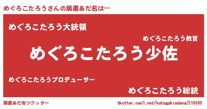 | 男性向けラノベタイトル風あだ名 | 『めぐろこたろう~年齢イコール彼女いない歴の魔法使い~』 |