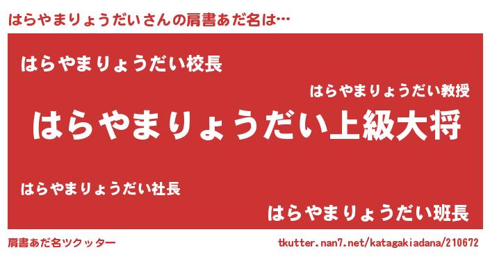 | 男性向けラノベタイトル風あだ名 | 『ハラヤマリョウダイスレイヤー』 |