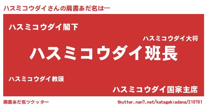 | 欧米人風あだ名 | 『ウサインハスミコウダイ』 |