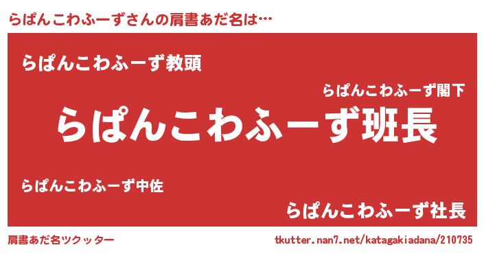 | 男性向けラノベタイトル風あだ名 | 『らぱんこわふーずの嫁は女の子じゃないと思った?』 |