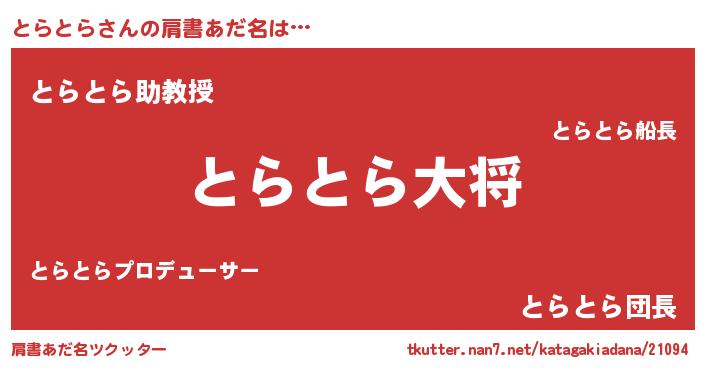 | 男性向けラノベタイトル風あだ名 | 『転生したらとらとらだった件』 |