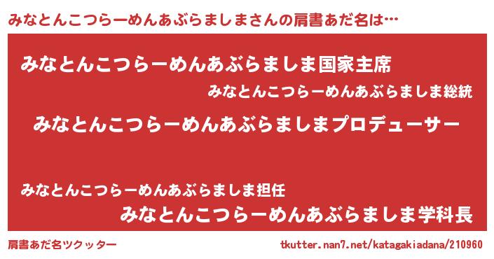 | 男性向けラノベタイトル風あだ名 | 『みなとんこつらーめんあぶらましまに滅ぼされるだけの簡単なお仕事です』 |