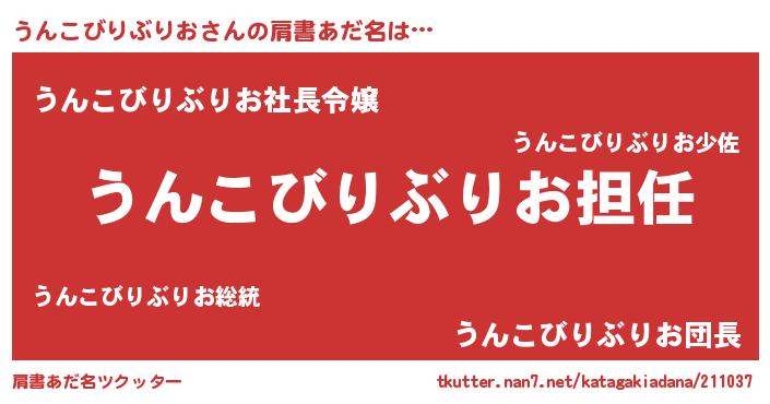 | 女子向けラノベタイトル風あだ名 | 『うんこびりぶりおの契約王妃』 |