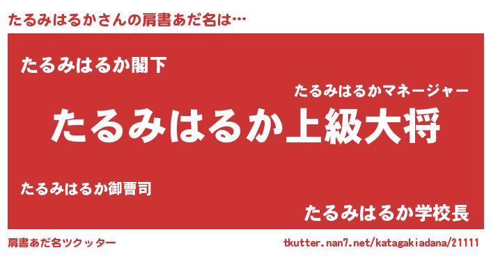 | 男性向けラノベタイトル風あだ名 | 『たるみはるか~年齢イコール彼女いない歴の魔法使い~』 |