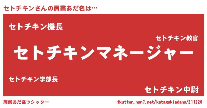 | 男性向けラノベタイトル風あだ名 | 『はたらくセトチキンさま!』 |