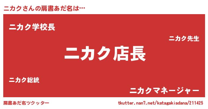 | 男性向けラノベタイトル風あだ名 | 『ニカクの憂鬱』『はたらくニカクさま!』 |