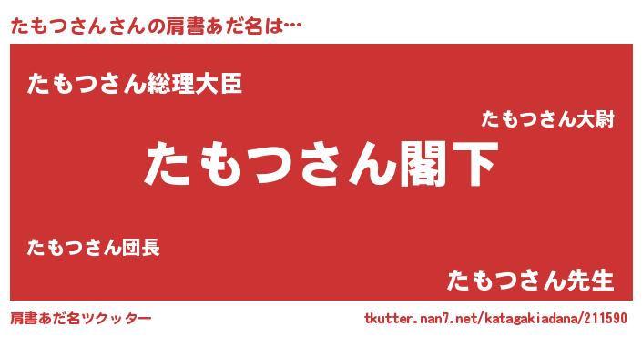 | 男性向けラノベタイトル風あだ名 | 『Re:たもつさんから始める異世界生活』 |