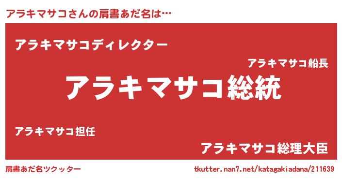 | ヒーロー風カッコイイあだ名 | 『最強戦士アラキマサコ』『仮面アラダー』 |