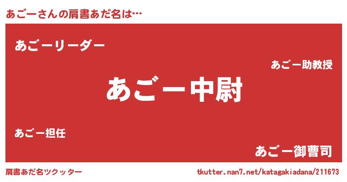 | 男性向けラノベタイトル風あだ名 | 『あごー~年齢イコール彼女いない歴の魔法使い~』 |