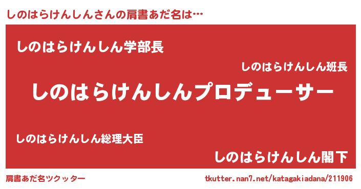 | 男性向けラノベタイトル風あだ名 | 『しのはらけんしんに滅ぼされるだけの簡単なお仕事です』 |