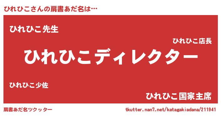 | 男性向けラノベタイトル風あだ名 | 『ひれひこに滅ぼされるだけの簡単なお仕事です』 |