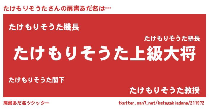 | 男性向けラノベタイトル風あだ名 | 『たけもりそうた~年齢イコール彼女いない歴の魔法使い~』 |