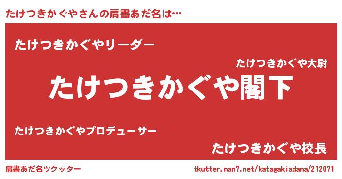 | 男性向けラノベタイトル風あだ名 | 『Re:たけつきかぐやから始める異世界生活』 |