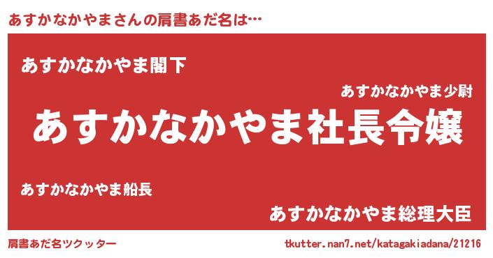 | 男性向けラノベタイトル風あだ名 | 『あすかなかやまの憂鬱』 |
