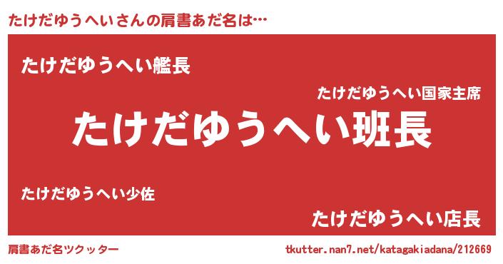 | 男性向けラノベタイトル風あだ名 | 『たけだゆうへいの嫁は女の子じゃないと思った?』 |
