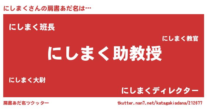 | 男性向けラノベタイトル風あだ名 | 『おまえをオタクにしてやるから、俺をにしまくにしてくれ! 』 |