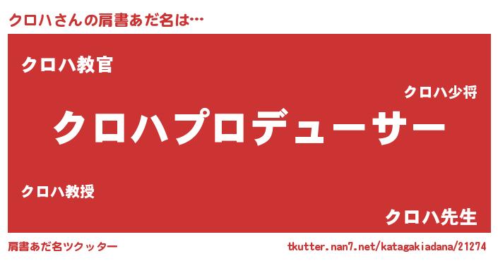| 男性向けラノベタイトル風あだ名 | 『クロハに滅ぼされるだけの簡単なお仕事です』 |