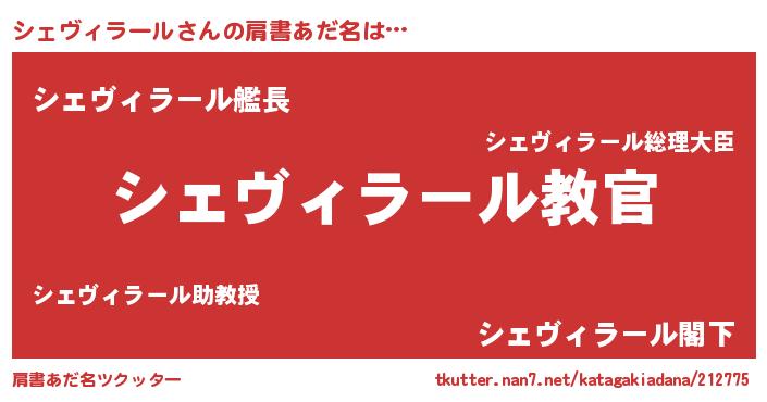 | 男性向けラノベタイトル風あだ名 | 『この素晴らしい世界にシェヴィラールを!』 |
