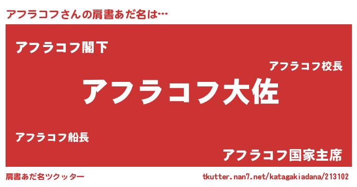 | 女子向けラノベタイトル風あだ名 | 『アフラコフの玉の輿計画!』 |