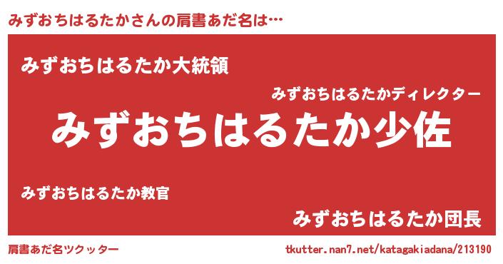 | 男性向けラノベタイトル風あだ名 | 『みずおちはるたか~年齢イコール彼女いない歴の魔法使い~』 |