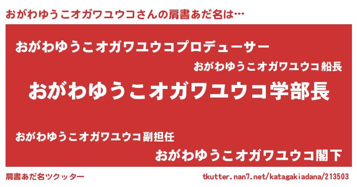 | 男性向けラノベタイトル風あだ名 | 『おまえをオタクにしてやるから、俺をおがわゆうこオガワユウコにしてくれ! 』 |