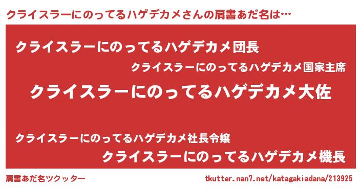 | 男性向けラノベタイトル風あだ名 | 『クライスラーにのってるハゲデカメ~年齢イコール彼女いない歴の魔法使い~』 |