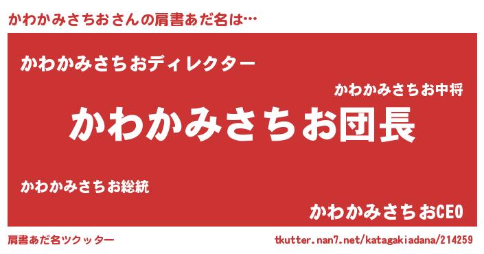 | 男性向けラノベタイトル風あだ名 | 『かわかみさちおの嫁は女の子じゃないと思った?』 |