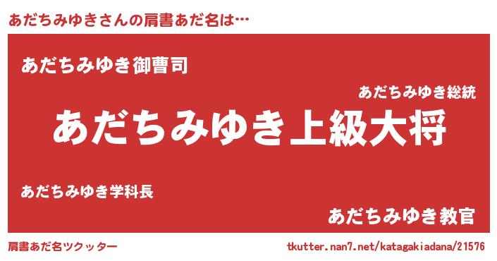 | 男性向けラノベタイトル風あだ名 | 『あだちみゆき~年齢イコール彼女いない歴の魔法使い~』 |