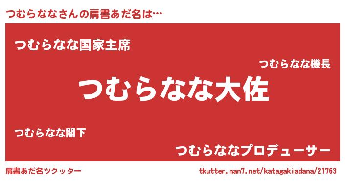 | 男性向けラノベタイトル風あだ名 | 『つむらなな~年齢イコール彼女いない歴の魔法使い~』 |