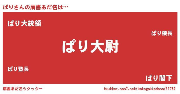 | 男性向けラノベタイトル風あだ名 | 『ぱり~年齢イコール彼女いない歴の魔法使い~』 |