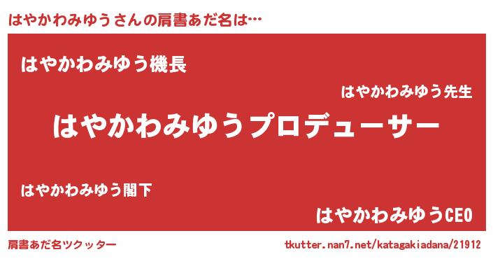 | 男性向けラノベタイトル風あだ名 | 『はたらくはやかわみゆうさま!』 |
